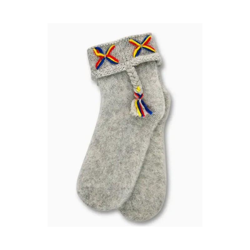 Chaussettes façon Lovikkavante chaudes en laine Shetland brossée avec motif nordique et pompon, pour les journées froides en extérieur ou en intérieur.