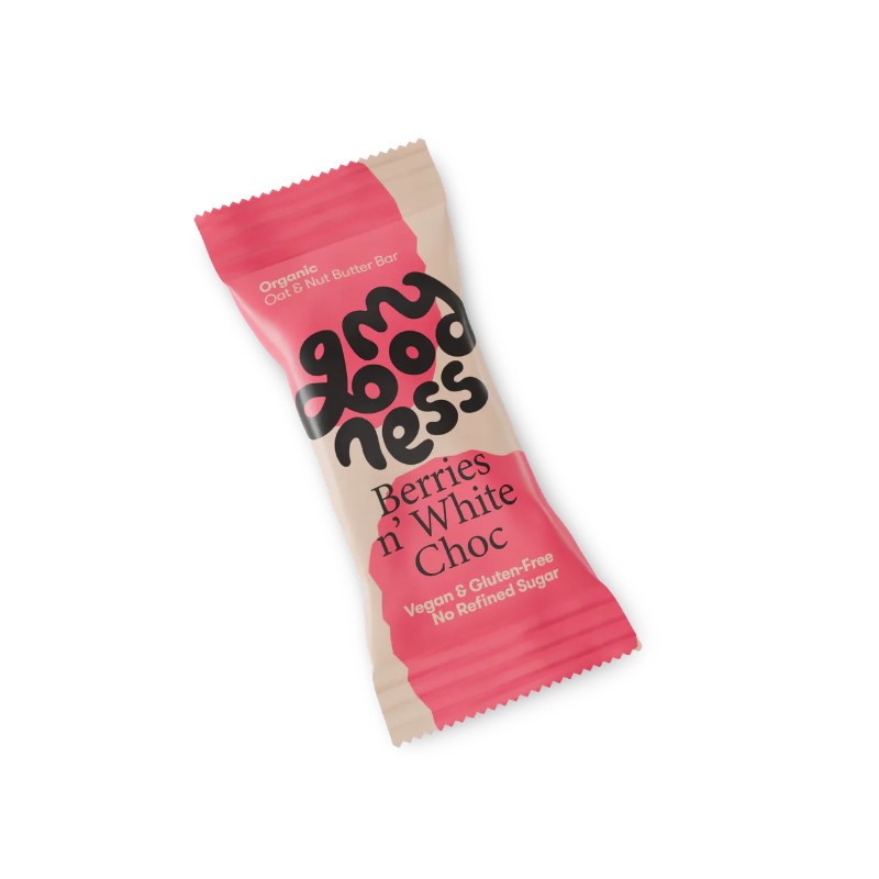 Ingrédients : Beurre d’amande* 24 %, avoine sans gluten* 23 %, sirop de noix de coco*, croustillant aux protéines de pois* (poudre de protéines de pois*, farine de riz*), chocolat blanc* 8 % (beurre de cacao* 40 %, sucre de coco*, avoine sans gluten*, sel marin*. Extrait sec de cacao : 40 % min.), beurre de cacao* 6 %, framboises* 3 %, canneberges avec jus de pomme* 3 %, épine-vinette* 3 %, canneberge* 1,5 %, poudre de betterave*, sel de mer*, arôme*.