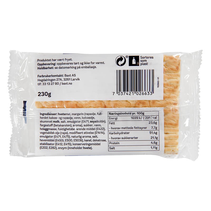 Ingrédients : Farine de blé, margarine (huile de colza, huile de noix de coco et de colza entièrement hydrogénée, eau, huile de coco, lait écrémé, sel, émulsifiant (e471, lécithine de soja), colorant (bêta-carotène), arôme), sucre, eau, pulpe d’œuf entier, humectant (e422), huile végétale (colza), amidon modifié (e1414), émulsifiant (e471, e475), arôme naturel, sel, agent levain (e450i, e500, e503ii), cannelle, dextrose, stabilisateur (e412, e415), conservateur (e202, e282), enzyme (contient blé).