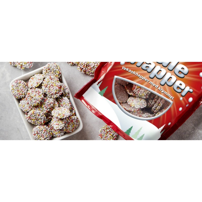 Des morceaux de vekao (terme désignant un produit à très faible teneur en cacao ou en chocolat), avec des petites boules de sucre colorées.